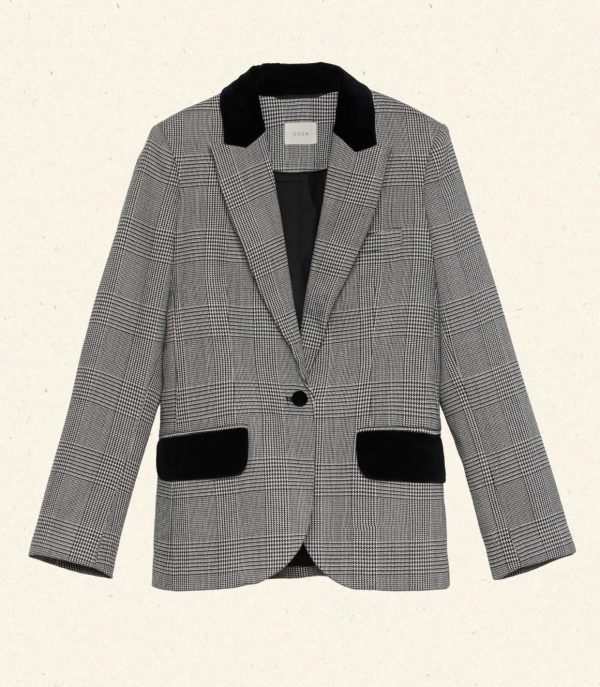 Inspired by ‘60s equestrian wear, the DÔEN Heirloom Casper Blazer—in a classic houndstooth check Italian wool blend—features a cutaway silhouette, velvet detailing at the collar and pocket flaps, and a single velvet covered button.
