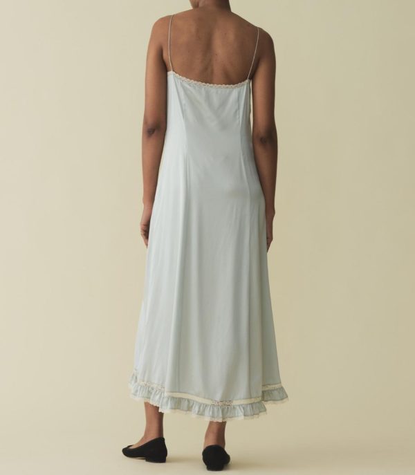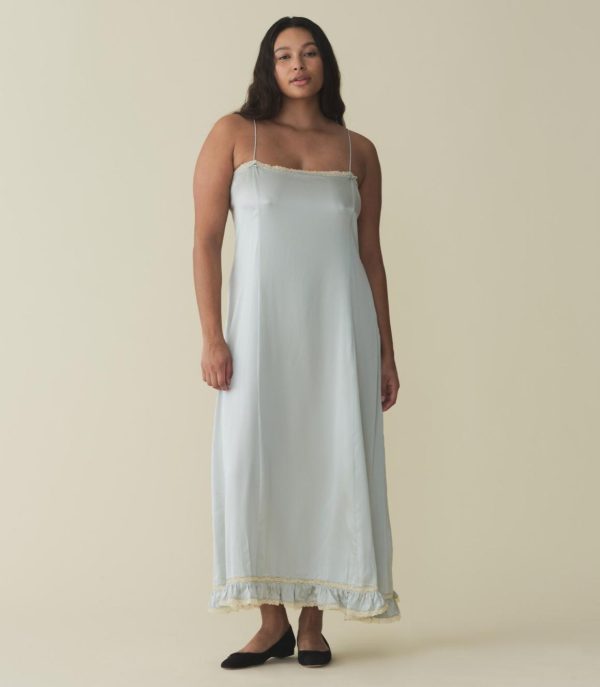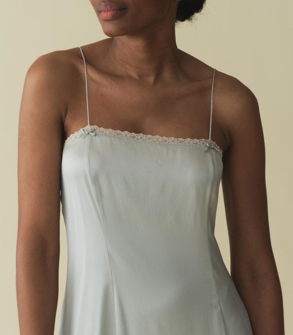 Crafted in 100% silk satin, the Celano Dress is our take on a ‘90s slip dress. It features antique-inspired bows, lace trim along the neckline, and a feminine ruffle at the hem.