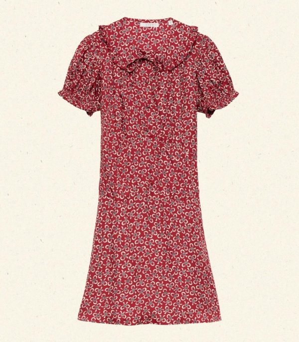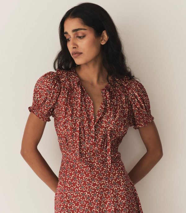 In a swingy silk-viscose twill, the Evienne Dress features a Peter Pan collar and short puffed sleeves trimmed with petite ruffles. A fitted waist with an adjustable back tie gives way to a mini-length A-line skirt. Self-covered buttons extend down the front.