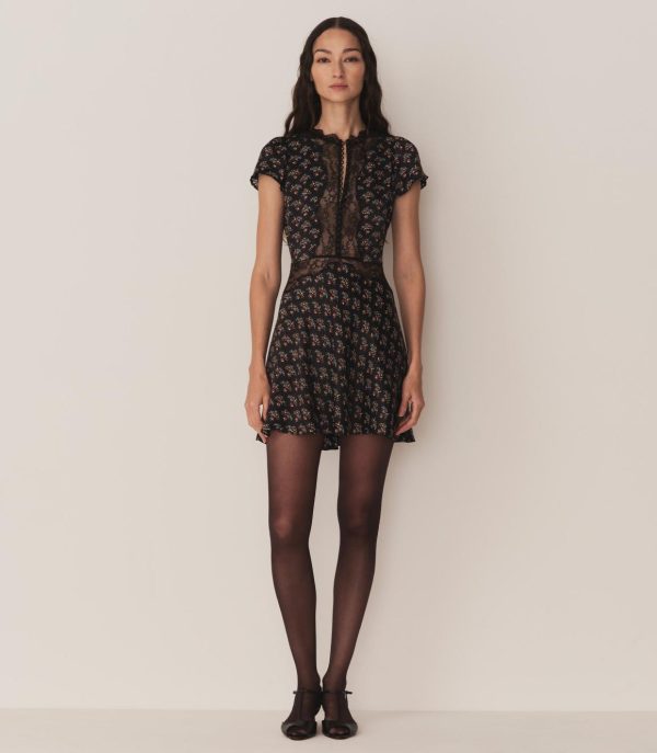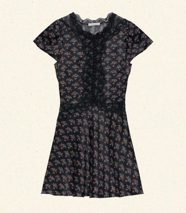Crafted from soft crepe back satin and rendered in our Victorian era-inspired Delphinium Floral, the Ivy Dress features short flutter sleeves, a crew neckline detailed with scalloped lace trim, and lace insets at the bodice and waist. A fitted waist with an invisible side seam zipper gives way to a bias-cut skirt, and a back waist tie allows for a more cinched fit. Lace-covered buttons dot the center front bodice.