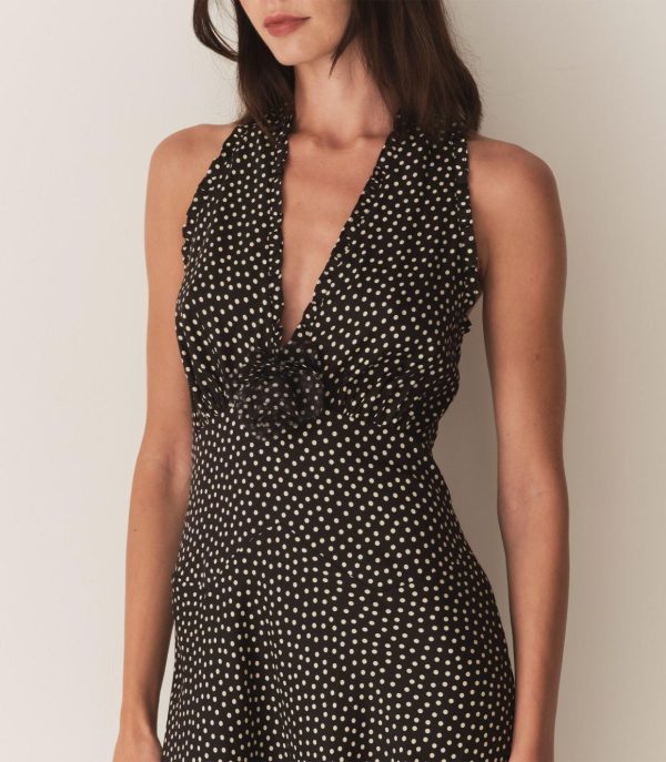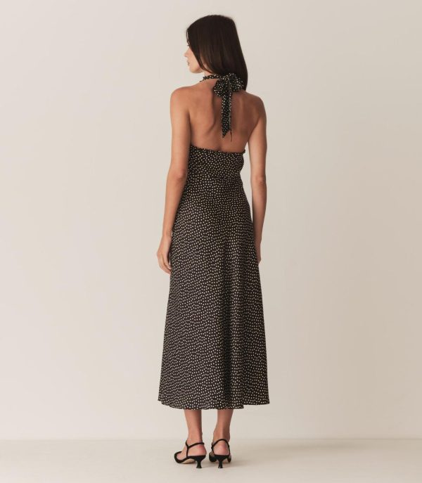 Crafted from a buttery silk-viscose twill and rendered in our nostalgic Camille Dot, the ‘90s-inspired Mazarin Dress features a plunging halter neckline adorned with petite ruffles and a removable rosette brooch, a fitted bodice with an invisible side zipper, and an ankle-grazing bias-cut skirt.