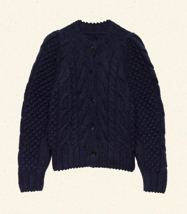Expertly handknit by artisans in Peru from a soft baby alpaca blend, the ‘50s-inspired Channel Cardigan features a crew neck, full-length raglan sleeves, faux horn buttons, and a cable design. Scallop crochet trim adorns the neckline and sleeve cuffs.
