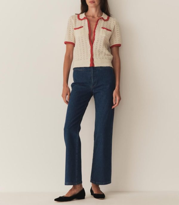 In a soft, lightweight blend of baby alpaca and silk, the ‘50s-inspired Gloriana Top features a Peter Pan collar, short sleeves, a fitted silhouette, and an allover pointelle design. The collar, center front placket, sleeve cuffs, and hem are trimmed with contrast scallop crochet detailing, while crochet-covered buttons extend down the front.
