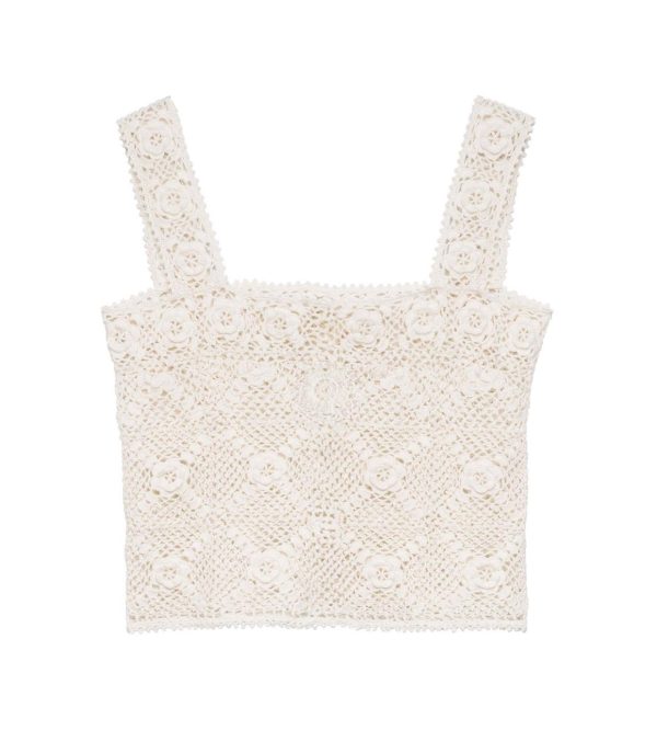 Hand-crocheted in Peru from soft Pima cotton, the DÔEN Heirloom Edwina Top—which draws inspiration from Victorian-era corset covers—features a square neckline, thick straps, a fitted silhouette, and an intricate allover floral crochet design. Scallop crochet trim adorns the neckline, straps, and slightly cropped hemline, while hand-crocheted buttons extend down the back.