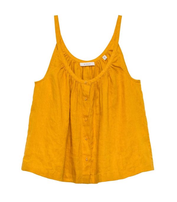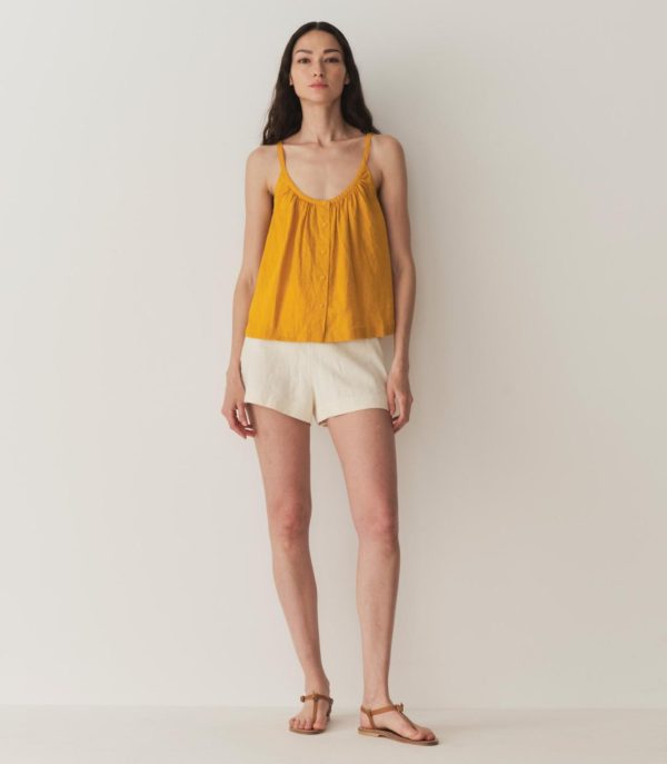 Crafted from soft midweight linen, the Nalina Linen Top features a gathered scoop neckline, slender straps, and a breezy cropped silhouette. Mother-of-pearl buttons extend down the front. Style tucked in or out with your favorite high-waisted jeans or shorts.